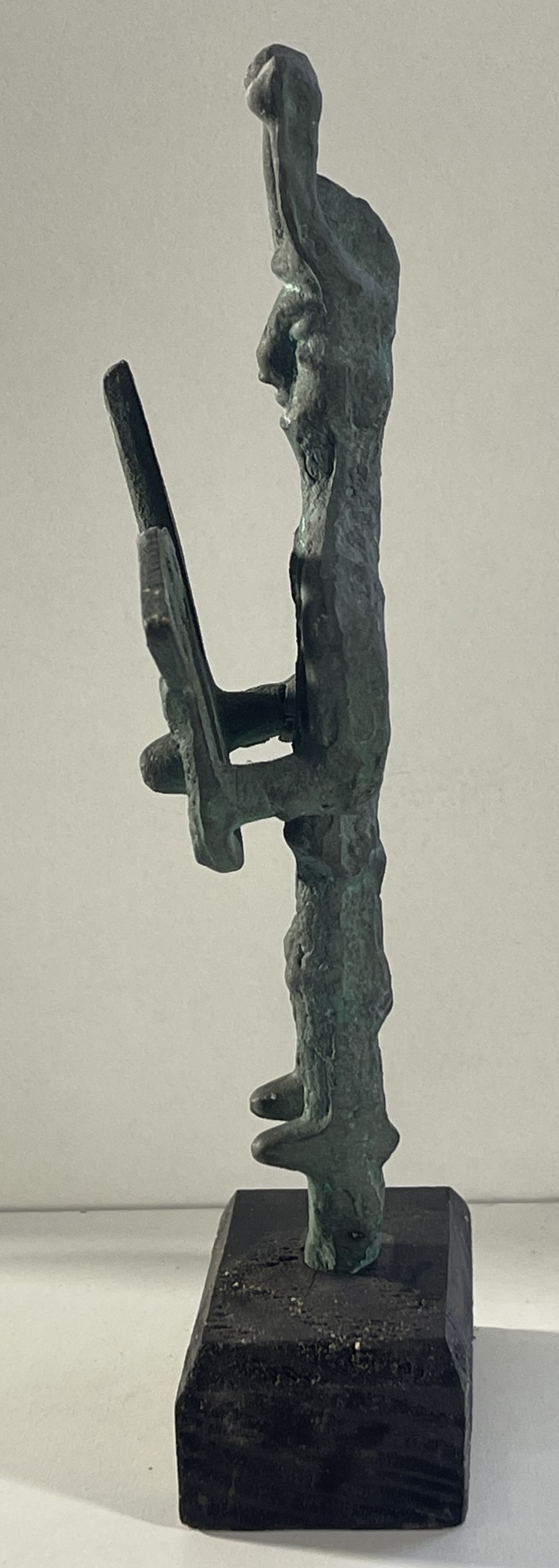 La sculpture présente un personnage élancé tenant un bouclier décoré et une arme, avec un casque caractéristique. Le style volontairement archaïque, aux formes allongées et aux volumes simplifiés, reprend fidèlement l'esthétique des bronzes votifs retrouvés sur de nombreux sites archéologiques de Sardaigne.