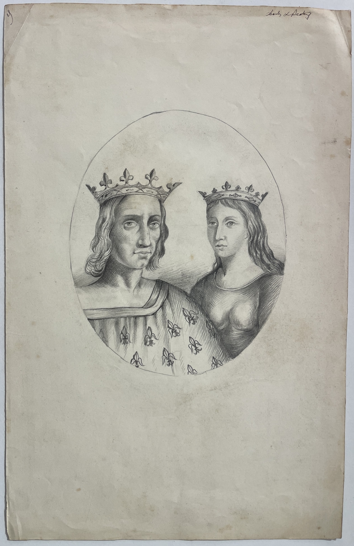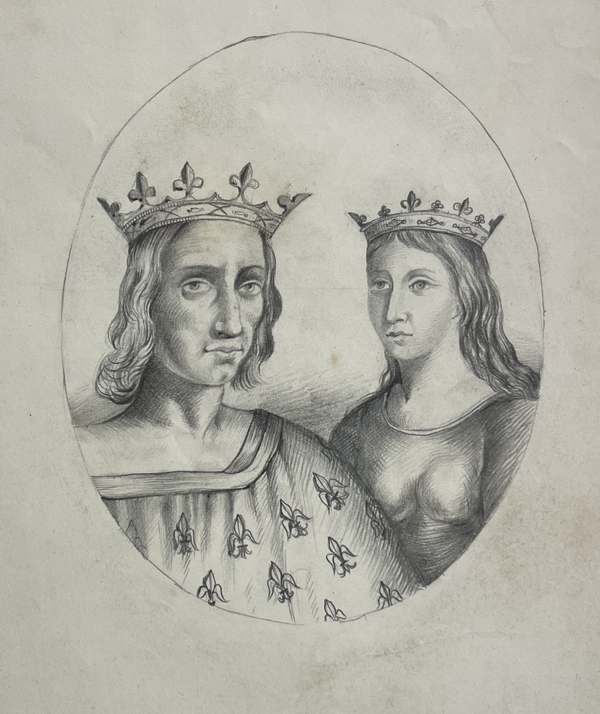 Les deux personnages sont représentés couronnés et vêtus de costumes royaux ornés de fleurs de lys, symboles de la maison capétienne et de la dynastie angevine. Ce type de dessin étaient fournis aux graveurs qui réalisaient ensuite la gravure sur bois destinée à l'impression de gravures historiques. Il en porte les marques. C'est donc le dessin qui a permis l'édition de la gravure vers 1850. Le portrait du couple est exécuté au crayon graphite sur grand papier, dans un médaillon tracé au compas avec un travail fin permettant de modeler les visages et les costumes.
