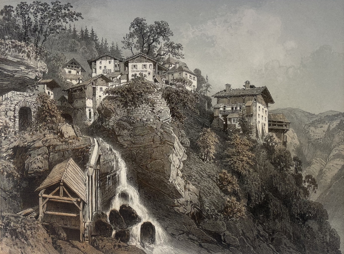 Cette lithographie, réalisée d'après un dessin de Félix Benoist, illustre avec précision un village alpin typique, accroché à flanc de montagne. La composition est particulièrement remarquable par la présence d'une cascade et d'un ouvrage hydraulique, apportant dynamisme et profondeur à la scène.