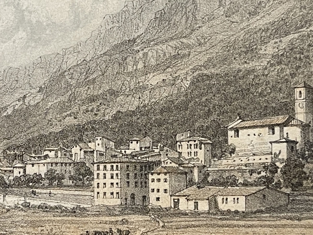 La composition est particulièrement équilibrée et typique des grandes vues topographiques de l'époque : le village s'organise autour de son promontoire rocheux dominé par une tour, tandis que la rivière serpente au premier plan, animée par des figures et scènes rurales. À l'arrière-plan, les reliefs escarpés de la vallée encadrent la scène et renforcent la profondeur.