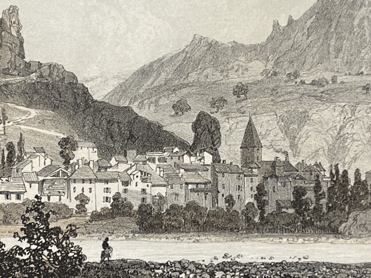 L'ensemble offre une vision très pittoresque et théâtrale de la vallée du Var, typique du regard romantique porté sur les paysages alpins au XIXe siècle.